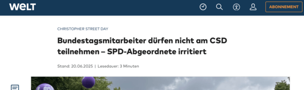 „Klöckner betont außerdem, dass es kein Verbot der Teilnahme von Beschäftigten der Bundestagsverwaltung am diesjährigen CSD gebe. Die private Teilnahme stehe den Mitarbeitenden der Bundestagsverwaltung ‚selbstverständlich frei – egal ob individuell oder als Gruppe‘.“ Doch so weit lesen eben viele erst gar nicht.