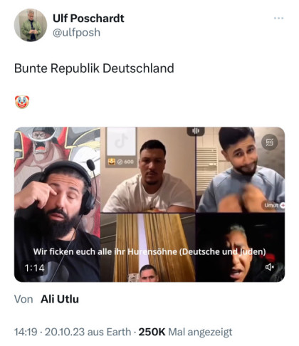 Ich glaube nicht, daß da ein Tanker gewendet wird, es wird der Rückwärtsgang eingelegt der soweit reicht wie man seine eigenen Verteidigungslinien noch halten kann. Das halbherzige Geschwafel zeigt wie die linksgrüne Mischpoke es mit der Wahrheit und der Rechtschaffenheit in ihrem Berufsstand hält. Der Fleischhauer sabbelt irgendwas vor sich hin, nett in Form von Fragen: Haben wir zu wenig…….? Hätten wir mehr…..? Da ist nichts von Einsicht mit seiner Weltanschauung gescheitert zu sein. All die A bis Z „Prominenten“ hüllen sich in Schweigen, wo sie doch sonst immer das Maul nicht weit genug aufreißen konnten wenn es um „keinen Millimeter nach Rächts“ ging. Denen hat niemand gesagt, welche Haltung sie jetzt einnehmen müssen und welches Wording jetzt benutzen müssen also Schweigen sie, ducken sich weg wie es Feiglinge immer tun. Das trifft übrigens auch auf die meißten Schreiberlinge zu, deren Verwirrung förmlich greifbar ist. Aber das ist nur eine kurzfristige Erscheinung, je länger der Konflikt dauert um so weniger sich die Menschen dafür interessieren umso schneller fallen sie wieder in ihre alte Verhaltensweisen zurück. Noch vergessen, ich las bei Tiktok, daß sich irgendeine Trudi der Grünen darüber beklagt hat, daß die AfD nicht genug gegen den Antisemitus getan hat also praktisch Mitschuldig an der Situation im Land ist. Perverser gehts nicht!