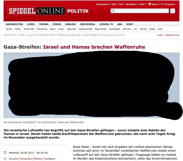 Spiegel Online hatte den „unfreundlichen Akt“ Israels somit frei erfunden. Prompt wurde die Lüge auf allen einschlägigen Seiten des Judenhasses als Beweis für Israels Rachsucht und Boshaftigkeit geteilt.
