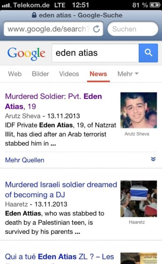Am 13. November 2013 wurde der 18-jähriger Israeli Eden Atias, der in einem Bus schlief, von einem arabischen Jugendlichen mit mehreren Stichen in den Hals erstochen. Eden Atias trug eine Soldatenuniform, da er sich in der Grundausbildung seines Wehrdienstes befand. Er war das, was man in Deutschland einen Wehrpflichtleistenden nennt. Sein Mörder beendete in vollem Bewusstsein das kurze Leben des jungen Mannes, über den er nichts wusste, den er nicht kannte, der ihm keinen Schaden zugefügt hatte, den er zufällig neben sich in einem Bus sah. Er mordete ihn als er schlief. Der Mörder war so von Hass erfüllt, dass er einen schlafenden jungen Mann meuchelte, der fast noch ein Kind war.