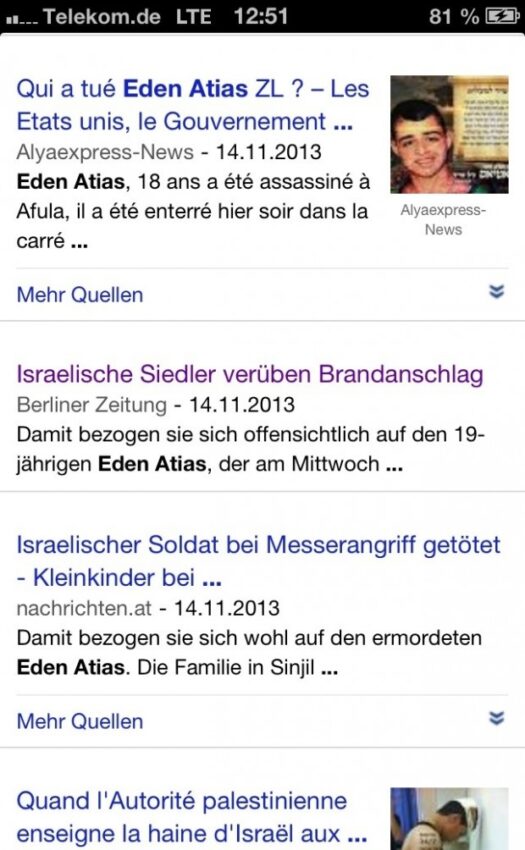 Die deutschen Medien schwiegen größtenteils über diesen Mord. Wenn man damals bei Google News den Namen „Eden Atias“ suchte, kamen viele ausländische Medien. Die erste Nachricht aus Deutschland war ein Artikel der Berliner Zeitung. Dort aber wurde getitelt: