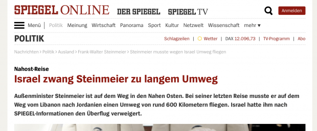 In dem Artikel wurde behauptet: „Bei seiner Nahostreise Mitte Mai ist Bundesaußenminister Frank-Walter Steinmeier (SPD) nach Informationen des SPIEGEL in schwieriges diplomatisches Gelände geraten: Da Israel bei seiner Nahost-Reise nicht auf seinem Besuchsplan stand, reagierte Jerusalem verärgert und zwang ihn zu einem Umweg.“