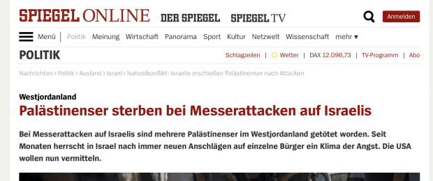 In dem Artikel stand: „Israelische Siedler im Westjordanland haben einen Brandanschlag auf das Haus einer palästinensischen Familie verübt – offenbar als Rache für den Tod eines 16-jährigen (sic!) israelischen Soldaten, der am Vortag in einem Bus erstochen worden war – Fünf palästinensische Kleinkinder haben bei einem mutmaßlichen Brandanschlag extremistischer Siedler auf das Haus ihrer Familie im Westjordanland eine Rauchvergiftung erlitten.“