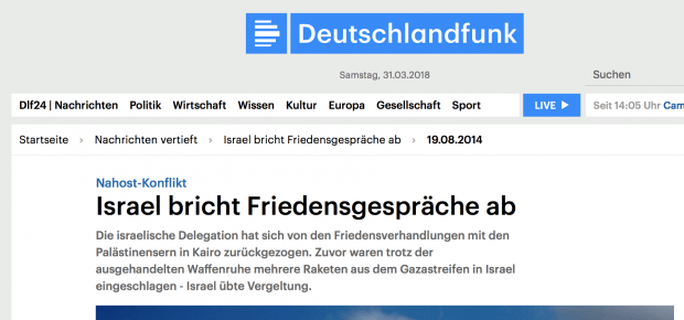 Das Friedensgespräch wurde somit laut der Schlagzeile des Deutschlandfunks nicht durch den Beschuss auf Israel abgebrochen, sondern erst durch das darauf folgende Verlassen der Friedensverhandlung durch Israel.