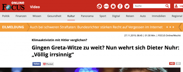 Als sich am Dienstag Nuhr auf Facebook meldet und darauf hinweist, er habe Thunberg weder direkt noch indirekt noch Andeutungseise mit Hitler/Stalin verglichen („Ich habe Greta nicht mit der Ideologie Hitlers oder Stalins in Verbindung gebracht. Dies wäre völlig irrsinnig. Andere Zeitungen schreiben die gezielten Falschinformationen der Kieler Nachrichten, die erkennbar dem Ziel größtmöglicher Aufmerksamkeit und damit erhöhter Klickzahlen dienen, kritiklos ab“), als sich nun offenbar etwas Zweifel bei manchen Medien breit macht, kommen Redakteure auf eine Idee: Die Behauptung lässt sich doch problemlos weiterverbreiten beziehungsweise, wie es im Branchenjargon heißt, „weiterdrehen“, wenn man einfach ein Fragezeichen hinter den nie belegte Vorwurf pappt. Also textet „Focus Online“: „Klimaaktivistin mit Hitler verglichen? Gingen Greta-Witze zu weit? Nun wehrt sich Dieter Nuhr: ‚Völlig irrsinnig’.“