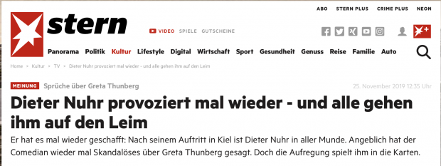 „Doch vielleicht gehen all die Empörten dem Comedian auf den Leim und verhalten sich genau so, wie der es wünscht. Denn seit der 59-Jährige gemerkt hat, dass er mit kalkulierten Provokationen gegen die junge Schwedin Aufmerksamkeit erzeugt, spielt er diese Karte immer wieder. Mehrfach in seiner Sendung ‚Nuhr im Ersten’, nun auch auf seinen Liveauftritten.