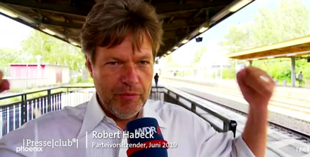 Anmerkung: Man halte sich vor Augen, dass zuvor ein Einspieler über Robert Habeck gezeigt wurde, in dem der Vorsitzende wie ein softer Popstar beschrieben wird: beliebt, klug, sympathisch und vernünftig. Immer wachsweich lächelnd, das Haar verwuschelt, auf der Meeresbucht. Oder wie Habeck das Motto ausgibt, bloß nicht auf die eigene Brust klopfen – und tut das bildlich – wir seien die Besten. Wir müssen weiter arbeiten, so Habeck, und mutet dabei eher wie ein Erlebnispädagoge in einem Stuhlkreis an.