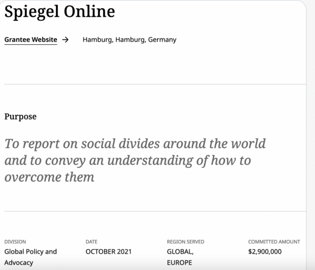Erfreuliche Nachrichten für den SPIEGEL: Die Bill and Melinda Gates Foundation unterstützt SPIEGEL Online nach eigenen Angaben ab Oktober 2021 mit einer weiteren Zuwendung von insgesamt 2,9 Millionen Dollar. Zuständig für die Zahlung ist die Abteilung „Global Policy and Advocacy“ der Stiftung. Zweck der Unterstützung durch die Stiftung sei es, „über die soziale Spaltung rund um die Welt zu berichten und ein Verständnis dafür zu liefern, wie sie überwunden werden kann“.