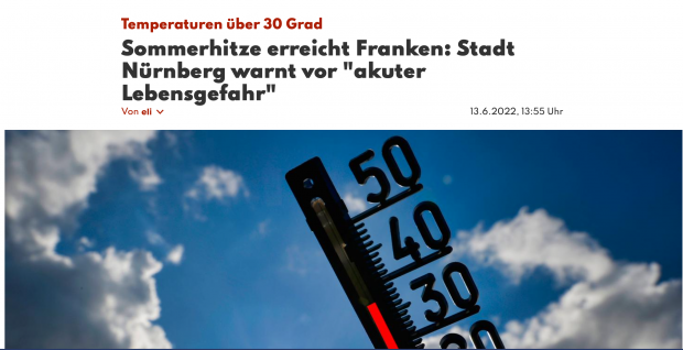Die Sonne lacht zurzeit über Deutschland, und damit auch über Nürnberg einschließlich seiner Stadtverwaltung. Die kündigt nämlich laut Nachrichtenportal Nordbayern „Temperaturen über 30 Grad“ an, und bereitet die Einwohner schon einmal auf das Schlimmste vor: „Sommerhitze erreicht Franken: Stadt Nürnberg warnt vor ‚akuter Lebensgefahr‘.“