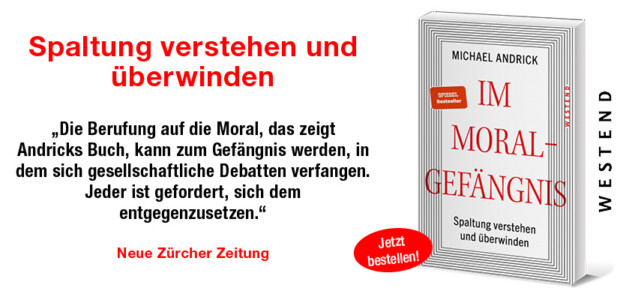 Michael Andrick, Im Moralgefängnis. Spaltung verstehen und überwinden. Westend Verlag, Paperback, 160 Seiten, 18,00 €.