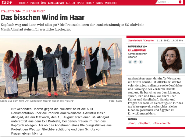 Masih Alinejad erfährt nicht nur Zuspruch für ihren Einsatz. Im Gegenteil: Sie muss viel Kritik von westlichen Feministinnen in Kauf nehmen. Vor nicht einmal zwei Wochen hat die Taz-Korrespondentin Julia Neumann in einem Kommentar moniert, dass nicht das Kopftuch das Problem sei, das es zu bekämpfen gelte. Laut Neumann bediene Alinejad „die Erzählung, dass Frauen vom Kopftuch und damit vom Islam befreit werden müssten“. In Wahrheit seien das aber „westliche Ideologien“. Ihr Argument: In Deutschland komme ja auch niemand auf die Idee, Nonnen zu ermuntern, ihr Kopftuch abzulegen und so gegen das Patriarchat der Kirche zu kämpfen.