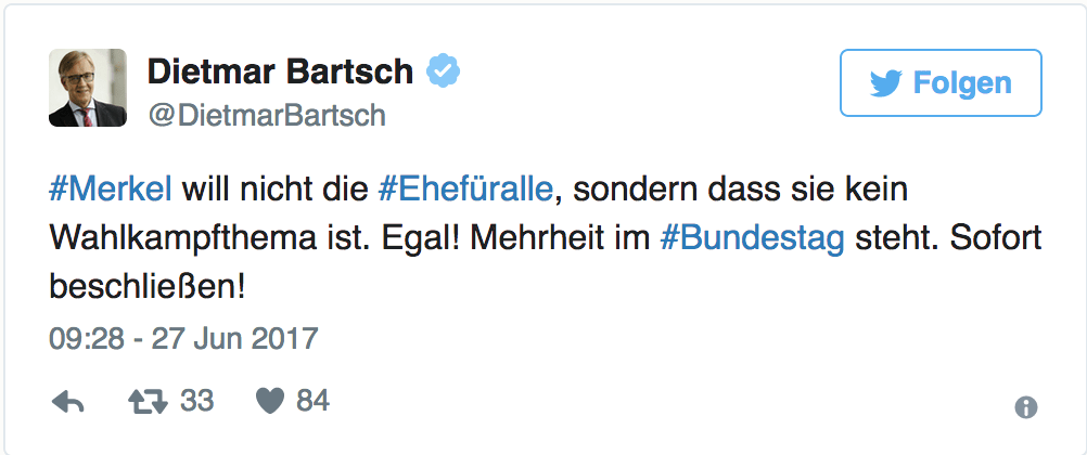 Aber die Politkinder, nun einschließlich der Partei die Linke, begreifen nichts. Jetzt sofort abstimmen, noch vor Ende dieser Parlamentsperiode, fordern sie inflationär auf Twitter und überhaupt. Sofort beschließen, sagt etwa Dietmar Bartsch, weil: „#Merkel will nicht die #Ehefüralle, sondern dass sie kein Wahlkampfthema ist.“ Nähme Merkel das auf, wäre es als Wahlkampfthema mausetot. So es denn überhaupt ein Wahlkampfthema ist, das nennenswerte Wählerstimmen bewegt: wenn ja, dann nur zwischen den kleinen Parteien.