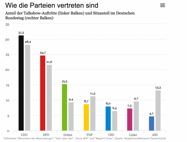 Nach dem Rundfunkstaatsvertrag ist die „Ausgewogenheit“ des Programms beim öffentlich-rechtlichen Rundfunk nach § 11 Abs. 2 RStV zu berücksichtigen. Das heißt natürlich nicht, dass Parteien genau gemäß ihrem Wahlergebnis in Talkshows präsent sein müssen. Aber es fällt schon auf, dass grüne Politiker sehr viel häufiger vertreten waren als es ihrem Wahlergebnis entspricht, während Linke und FDP, aber vor allem die AfD unterproportional vertreten sind.