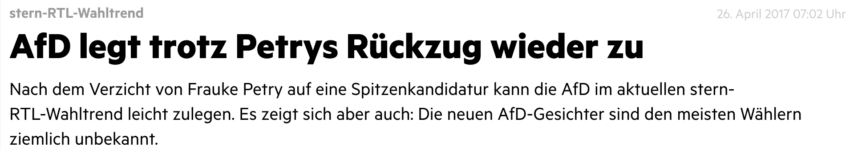 Ersteres die Headline vom stern, zweites eine fiktive Überschrift“ . Beides stimmt nicht, weder die real existierende Überschrifft noch die zweite nicht reale. wenn die Umfrage vor dem Parteitag der AfD durchgeführt wurde.