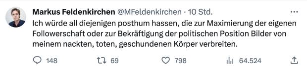 Die Bilder der von Hamas-Terroristen durch die Straßen gekarrten Frauenleiche kollidierte bei etlichen Journalisten offenbar mit ihrem betonfesten Bild der leidenden Palästinenser, die nichts sehnlicher wünschen als den Frieden, den Israel ihnen nicht gönnt. Den Konflikt mit seiner Weltsicht löst der Spiegel-Redakteur Markus Feldenkirchen kurzerhand dadurch, dass er nicht den Mord an der Frau und ihre Zurschaustellung kommentiert – sondern den ihm unbehaglichen Umstand, dass diese Bilder in den sozialen Netzwerken zu sehen sind.