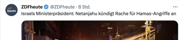 Auch das ZDF bemühte sich um eine entsprechende Rahmung der Ereignisse, neudeutsch: Framing. Jedes angegriffene Land besitzt das Recht auf Selbstverteidigung – das selbstverständlich auch Schläge gegen Kommandozentren und Raketenbasen der Hamas einschließt. Das ZDF macht daraus, ganz im Stil der Süddeutschen: „Netanjahu kündigt Rache für Hamas-Angriffe an“, und bedient damit das perfide Bild des ‚rachsüchtigen‘ Juden, als ginge es um eine private Vendetta.