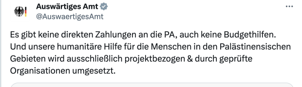 Apropos finanzielle Unterstützung: Auch am Wochenende hielt das von Annalena Baerbock geleitete Auswärtige Amt noch an seiner realitätsfremden Beteuerung fest, die aus der deutschen Steuerkasse gezahlten Hilfsgelder an die Palästinensische Autonomiebehörde und Projekte im Gazastreifen würden nicht in den Terror gegen Israel fließen – als ob Deutschlands Regierung das kontrollieren könnte oder auch nur wollte.