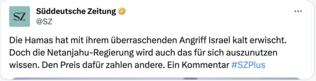 An die Spitze der Relativierer stellte sich die Süddeutsche Zeitung, die bekanntlich noch vor kurzem (vergeblich) versuchte, den Chef der Freien Wähler Hubert Aiwanger der Autorenschaft eines antisemitischen Pamphlets zu überführen, das er mit 16 verfasst haben soll. An dem Terrorangriff der Hamas findet die Süddeutsche vor allem interessant: „Die Netanjahu-Regierung wird auch das für sich auszunutzen wissen.“