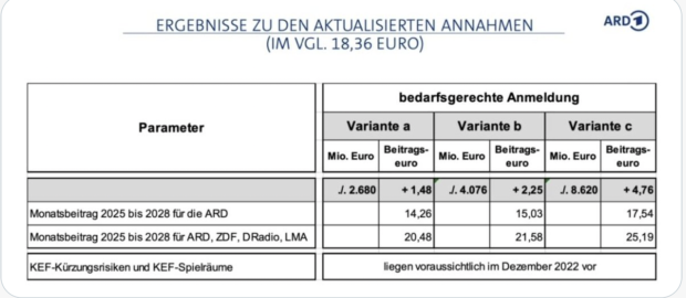 Eigentlich sollte die Kalkulation noch intern bleiben: Die ARD entwickelte für eine Intendantentagung drei Szenarien, nach denen der Rundfunkbeitrag ab 2025 steigen soll. In der niedrigsten Variante wären statt derzeit 18,36 in Zukunft 20,48 Euro monatlich für ARD, ZDF und Deutschlandfunk fällig, in der mittleren 21,58 Euro und in der dritten 25,19 Euro.
