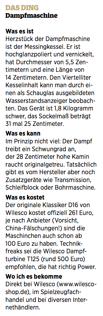 Aber die kleine Maschine war teuer. Sehr teuer sogar: mehrere Hundert Mark. Nicht dran zu denken, so eine jemals selber zu besitzen. Und jeder versicherte mir, wie unsinnig so eine Konstruktion doch war, die nichts konnte, als sich selbst anzutreiben. Dass sie eigentlich immer nur im Regal stehen und einstauben würde. Das war natürlich richtig und vernünftig, und so vergingen die Jahre ohne Dampfmaschine. Irgendwann war die Kindheit vorbei und damit auch die Berechtigung, sich eine Dampfmaschine zu wünschen. Dann machte ich eines Tages zwei Entdeckungen: Erstens, ich wurde Vater, und zweitens, die Dampfmaschine wurde immer noch hergestellt, und zwar praktisch unverändert. Ich verband beide Erkenntnisse zu einem Entschluss und war kurz darauf Besitzer eines solchen Wunderwerks. Zu Weihnachten wurde sie angeworfen.