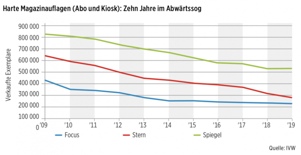 Weil der Abwärtssog der einstigen Politmagazine so überdeutlich ist, hatten die Verlagsleitungen Ende Oktober 2018 sogar geplant, aus der Meldung der IVW-Heftauflagenzahlen 2019 auszusteigen – negative Fakten stören nur. Nach Häme in Branchendiensten über die selbsternannten Sittenwächter machten die Verlagsoberen einen Rückzieher. So oder so – ihren Niedergang können sie nicht aufhalten. Die abflauende Konjunktur und noch weiter sinkende Werbeerlöse lassen Schlimmes fürchten.