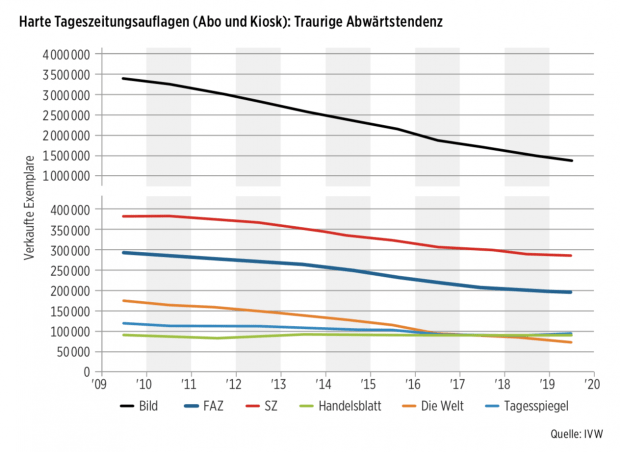 „Denn die Auflage des “Handelsblatts” war zuletzt rückläufig. Zwar stieg die verkaufte Auflage im 2. Quartal 2019 gegenüber dem vergleichbaren Vorjahreszeitraum um 4,5 Prozent, allerdings nur, weil die Düsseldorfer die Zahl der sonstigen Verkäufe um mehr als 62 Prozent anhoben. Der Einzelverkauf brach dagegen im Berichtszeitraum um mehr als 22 Prozent ein, die Zahl der Abos ging um 1,56 Prozent zurück. Auch bei der “WirtschaftsWoche” schrumpften der Einzelverkauf und die Abo-Zahlen in diesem Zeitraum deutlich.“, schreibt der Branchendienst Meedia.