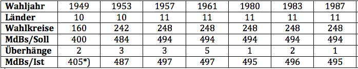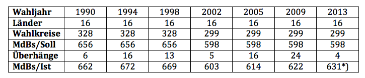 Ausgenommen bei den Wahlen von 1965, 1969, 1972, 1976, in denen es keine Überhänge gab, haben die Sollzahlen der Mitglieder des Bundestages niemals mit den Ist-Zahlen übereingestimmt. 2009 war der Abstand am größten. Er wurde aber durch die 2013 neu eingeführten Ausgleichsmandate noch überboten. Durch den Mandatsausgleich ist der Gesetzgeber also „vom Regen in die Traufe geraten“.