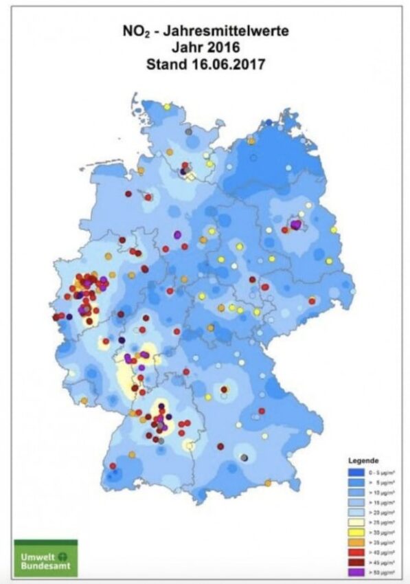 Abbildung 2: Im Jahr 2016 wurden die NO2-Grenzwerte nur in einigen meist größeren Städten überschritten. Der weit überwiegende Teil Deutschlands liegt bereits unterhalb der Grenzwerte (Grafik: UBA).