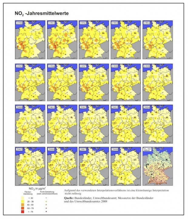 Abbildung 3: Rückgang der NO2-Immissionswerte in Deutschland von 1990 bis 2008 (Grafik: UBA).