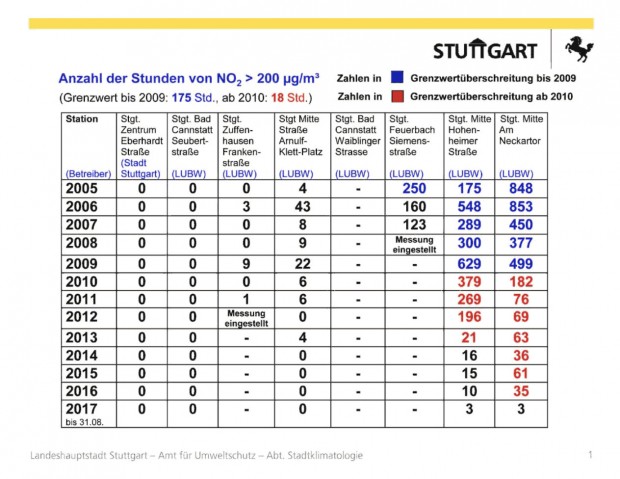 Abbildung 4: In Stuttgart sind die Überschreitungen des NO2-Grenzwerts von 200 µg/m3 seit Jahren rückläufig (Quelle: Landeshauptstadt Stuttgart – Amt für Umweltschutz).