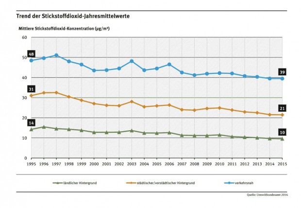 Abbildung 5: Schon 2015 lag der Durchschnittswert aller Messstellen selbst in hoch belasteten Städten unter dem gesetzlichen Grenzwert. Die Tendenz ist in allen Bereichen fallend (Grafik: UBA).