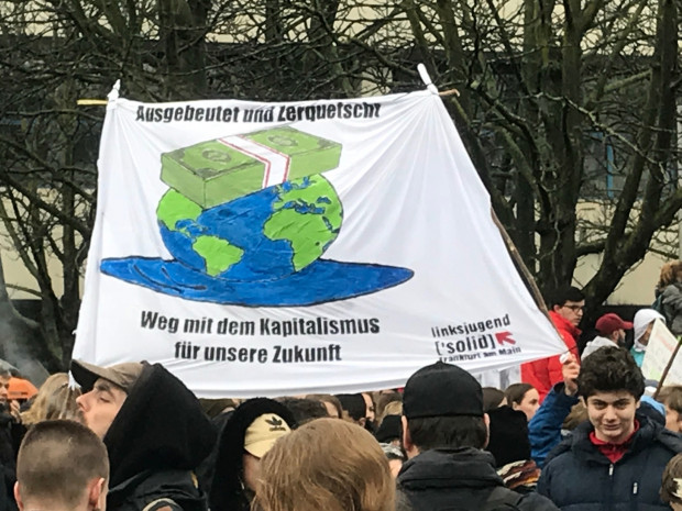 Was bei Anti-Merkel-Demonstrationen wie in Dresden oder Chemnitz heftig kritisiert wurde — dass harmlose Bürger gemeinsam mit Extremisten auf die Straße gehen — interessiert offenbar niemanden, wenn es ums Klima geht. Denn die ergrauten Stalinisten der MLPD waren nicht die einzigen Linksradikalen, die sich bei „Fridays for Future“ unter die streikenden Frankfurter Schüler mischten. Ein Transparent der „Linksjugend Solid“ wurde mitten im Demonstrationszug hochgehalten. Das Motiv: eine Erdkugel, auf der ein erdrückender Stapel Dollarscheine lastet. Die Textbotschaft: „Ausgebeutet und zerquetscht — Weg mit dem Kapitalismus für unsere Zukunft“. Und vorneweg lief ein Mittzwanziger im schwarzen Kapuzenpulli, der den minderjährigen Demonstranten kräftig einheizte. „A, Anti, Anticapitalista!“, skandierte er mit krächzender Stimme einen Schlachtruf der Autonomen-Szene. Die klimabewegten Schüler schrien ihm nach, so laut sie konnten. Ihre Eltern, Lehrer und sonstigen Begleiter zückten die Handykameras und strahlten begeistert.