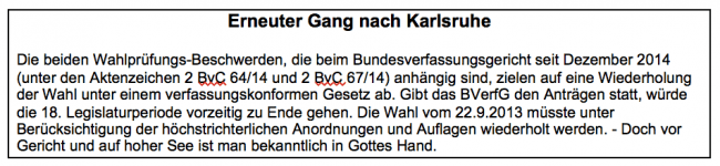 Das Bundeswahlgesetz – es gilt das 22. seiner Art in nur 18 Legislaturperioden seit der Entstehung der Bundesrepublik im Jahre 1949 – ist vor dem Bundesverfassungsgericht dreimal zu Fall gekommen: 1998, 2008 und 2012. Bei insgesamt 18 Bundestagswahlen wurden 14mal mehr Listenplätze verteilt als es im Bundestag Sitze gab. Davon viermal im zweistelligen Bereich, und zwar 1994, 1998, 2005 und 2009. Dreimal überschritt die Zahl der „Überhangmandate“, also der abgespaltenen, nicht personalisierten Listenplätze die vom Verfassungsgericht gezogene Obergrenze von 15 Sitzen. Wahlprüfungs-Beschwerden, die gegen das geltende Wahlrecht vor dem Verfassungsgericht in Karlsruhe Sturm laufen, konnten nicht ausbleiben. Gründe dafür gibt es genug.