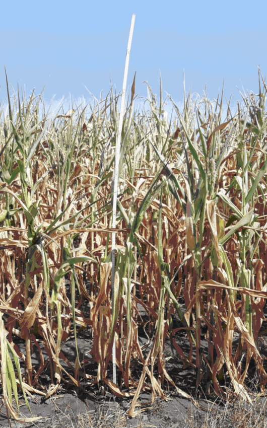 Das Foto oben zeigt den Maisacker von der Seite. Zum Vergleich zeigt das dritte Foto einen vertrockneten Maisacker in nur ca. 500 m Entfernung, der keinen Anschluss an das Grundwasser hat. In der Regel streuen die Landwirte das Wetterrisiko über alle Kulturen und alle verfügbaren Bodenarten. Im Jahre 2017 litt der obere „gute“ Acker unter zuviel Wasser, während der untere vertrocknete Acker bei optimaler Wasserversorgung einen hervorragenden Bestand aufwies. Jedoch werden diese Möglichkeiten durch die wie Mehltau wuchernde Bürokratie, immer weiter eingeschränkt.