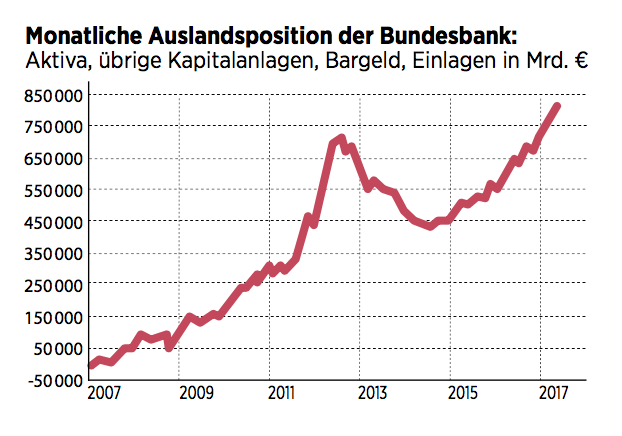 Die aufgetürmten Defizite durch Handelsbilanzüberschüsse Deutschlands bei gleichzeitiger Kapitalflucht aus den Peripheriestaaten der EU nach Deutschland führen dazu, dass die Bundesbank der Hauptgläubiger dieses Überziehungskontensystems ist. Dort stehen allein 800 Milliarden Euro im Feuer. Dazu kommen die Rettungsvehikel, die Deutschlands Regierung den Partnern im Euro zur Verfügung gestellt hat.