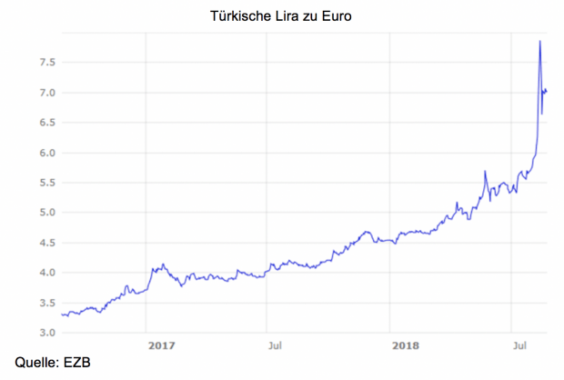 Die türkische Lira ist derzeit weiter auf Abwärtskurs. Seit Anfang 2017 hat sie rund die Hälfte ihres Wertes verloren: