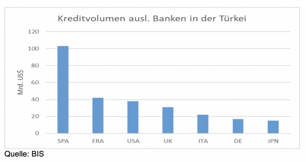 Nach Angaben von Reuters wären die spanische BBVA, die italienische UniCredit, die französische BNP Paribas, die niederländische ING und die britische HSBC am stärksten gegenüber türkischen Zahlungsausfällen und einer fallenden Lira exponiert.