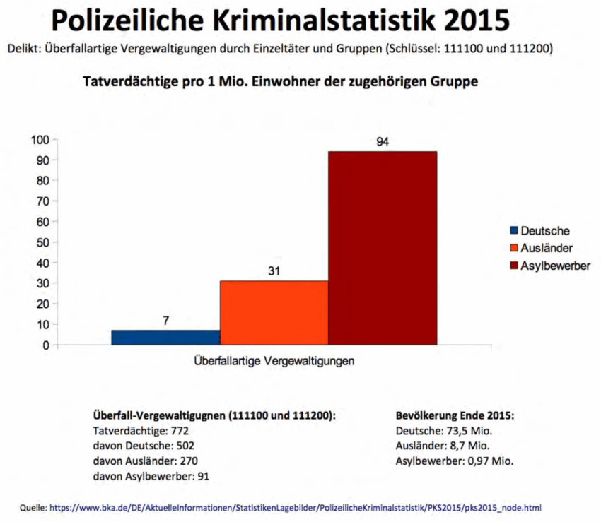 Ines Laufer hat anhand der Daten der Kriminalstatistik sowie mit Hilfe von Informationen über Aufklärungsquoten und das kriminologische Dunkelfeld eine realistische Zahl der tatsächlichen Gewalt- und Vergewaltigungsopfer berechnet, die allein im letzten Jahr “Flüchtlingen” zuzurechnen sind.