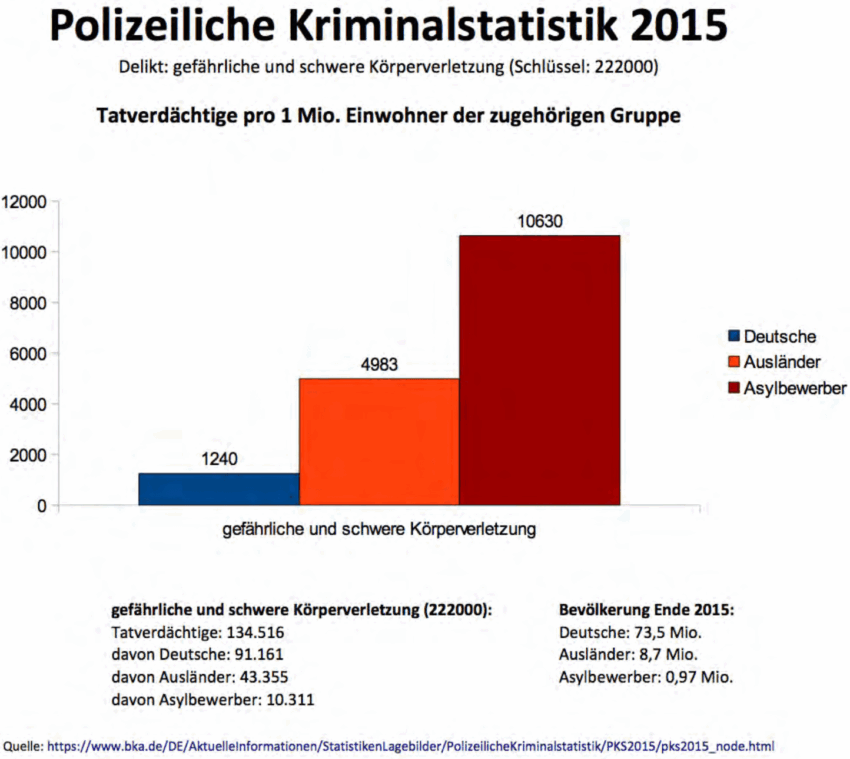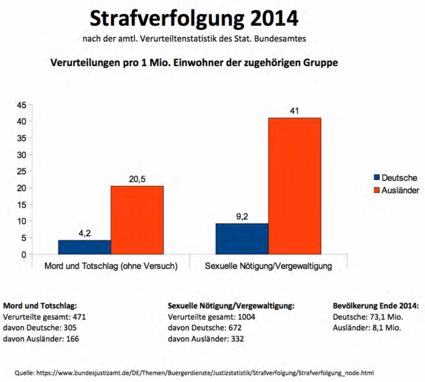 Wer die amtliche deutsche Kriminalstatistik der letzten Jahre las, der konnte ausrechnen, dass in Deutschland Bürger ohne einen deutschen Pass relativ zum Bevölkerungsanteil über 3 mal so häufig wegen einer Straftat verurteilt (!) wurden wie Bürger mit einem deutschen Pass. Das hätte jedem zu denken geben müssen.