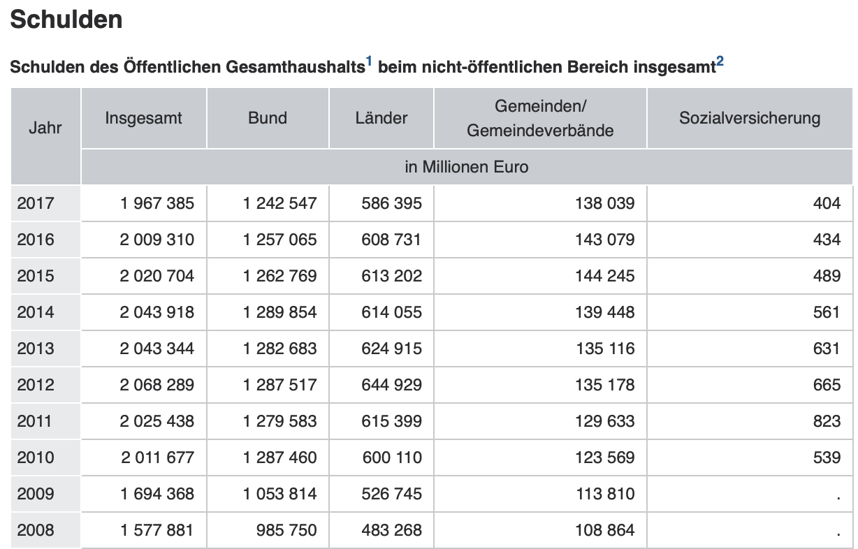 Ende des dritten Quartals sind die Schulden des Bundes nach Statistischem Bundesamt auf 1.226 Milliarden gesunken. Die Schulden des Bundes liegen damit immerhin um 240 Milliarden über dem Stand von 2008! Das liegt vor allem auch an den enormen Aufwendungen im Zuge der Finanzkrise (Bankenrettungsfonds etc.). Aber nicht nur. Die Schulden des Bundes sinken seit 2014. Bis jetzt um rund 63 Milliarden Euro. Dies entspricht ungefähr der Zinsersparnis von zwei Jahren. Dazu kommen wir aber noch.
