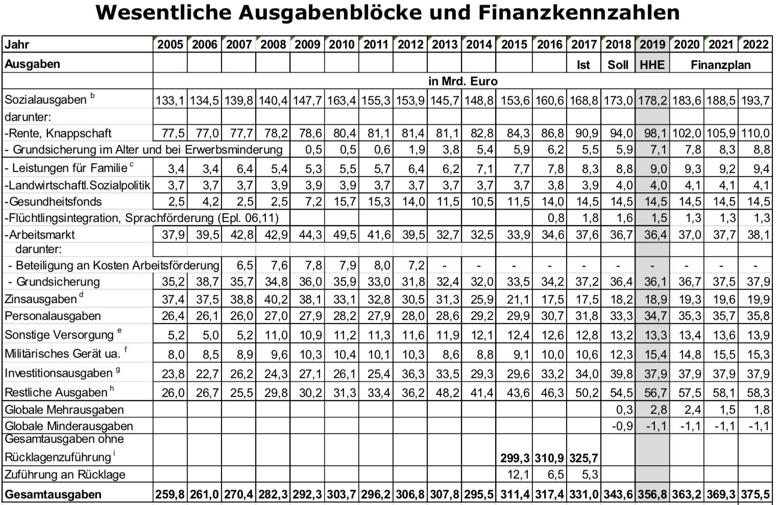 - Die Gesamtausgaben des Bundes stiegen in den zehn Jahren um 280 Milliarden Euro.
