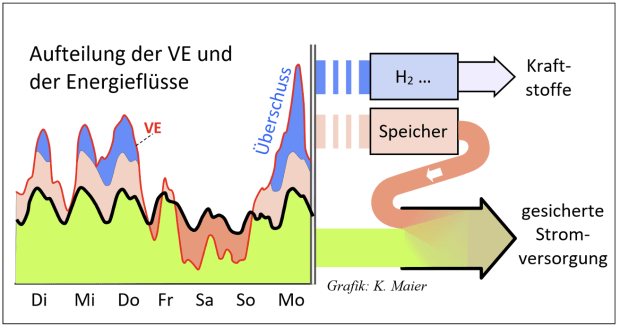Wenn zeitweise darüber hinaus noch Strom erzeugt wird, kann diese Überschussenergie (blau) für Wasserstofferzeugung genutzt werden. Auf diese Weise müsste (theoretisch gesehen) keine Abregelung der VE-Anlagen erfolgen.