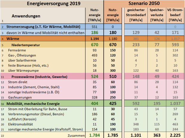 Wie Abb. 3 zeigt, werden die in 2019 bestehenden Nutzenergiemengen der vier Anwendungsfelder durch etwa die gleichen Nutzenergiemengen in der Zukunft ersetzt, diese aber meist auf andere Weise bereitgestellt (Details siehe [3]). Beispielsweise wird in diesem Szenario die Solarthermie von heute 10 TWh/a ausgebaut auf 50 TWh/a und die Technik der Wärmepumpe geht von 17,5 auf angenommene 300 TWh/a. Beides macht viel Wärme aus wenig Strom. Ziel ist, dass die Summe aller Wärmeerzeugungsarten wieder die gleiche Nutzenergie ergibt. Das Prinzip des Erhalts der Nutzenergie sichert den gesellschaftlichen Wohlstand und damit auch einen funktionierenden Sozialstaat.