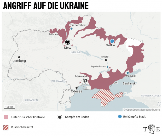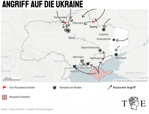 Die genauen Frontlinien in der Ukraine zu bestimmen, ist schwierig – einerseits, weil verifizierbare Informationen knapp sind, andererseits weil es diese auch teils gar nicht so wirklich gibt. Die russischen Truppen bewegen sich entlang meist großer Straßen schnell ins Landesinnere, bringen dabei oft eben aber kaum größere Gebiete tatsächlich unter Kontrolle. Die ukrainischen Truppen ziehen sich immer mehr in die Städte zurück, wo Russland seine militärtechnische Überlegenheit nicht voll ausspielen kann.