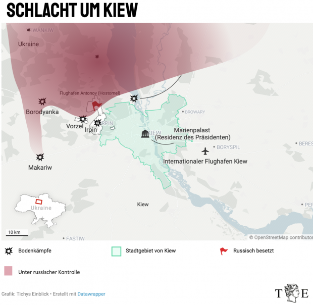 Bei Kiew stehen russische Truppen nun nördlich, östlich und westlich der Stadt und riegeln etwa bei Borodyanka und Makariw die zentralen Zufahrtswege in die Stadt ab. Zwar scheinen Zivilisten Kiew weiterhin verlassen zu können, inwieweit aber militärischer Nachschub noch in die Stadt gelangen kann, ist fraglich.