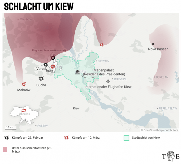 Doch der russische Angriff westlich von Kiew kommt kaum voran. Schon am Donnerstag in der vergangenen Woche erreichten russische Luftlandetruppen die Region, seit mindestens einer Woche wird bei Irpin fast ohne russischen Geländegewinn gekämpft. Zwischenzeitlich gelingt es ukrainischen Truppen immer wieder, wichtige Stellungen wie den Flughafen Antonov zurückzuerobern. Die Stadt Irpin ist weiterhin unter ukrainischer Kontrolle. Amateurvideos zeigen enorme Verluste auf beiden Seiten. Vermutlich hat die Ukraine in der Region ihre besten Einheiten zusammengezogen. Erobert Russland Irpin und übertritt den gleichnamigen Fluss, steht der Weg nach Kiew frei.