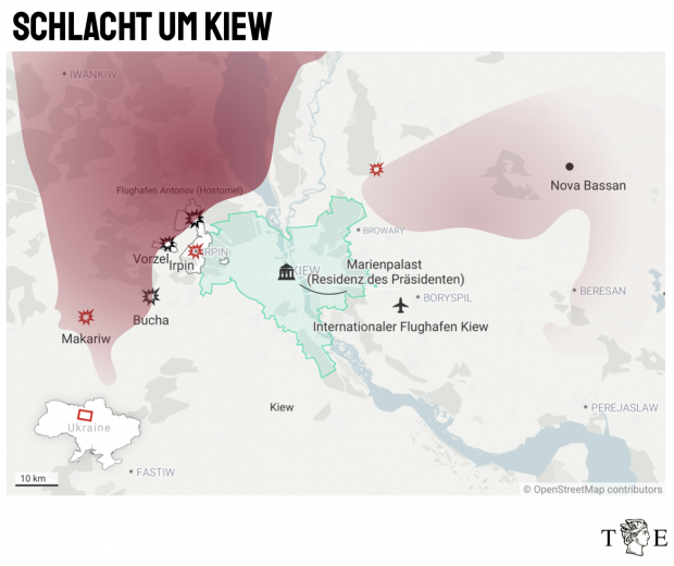 Der russische Vormarsch ist seit Tagen fast vollständig blockiert. Besonders deutlich wird das im Raum Kiew: Am 25. Februar erreichten die Truppen den Flughafen Antonov westlich von Kiew. Wenig später erreichte Russland den Ort auch vom Boden aus, es kam zu Gefechten entlang der Linie Vorzel – Hostomel – Butscha. Heute – zwei Wochen später – sind die drei Städte immer noch umkämpft, die Kämpfe wurden lediglich auf das nur wenige Kilometer entfernte Irpin ausgeweitet (siehe Karte).