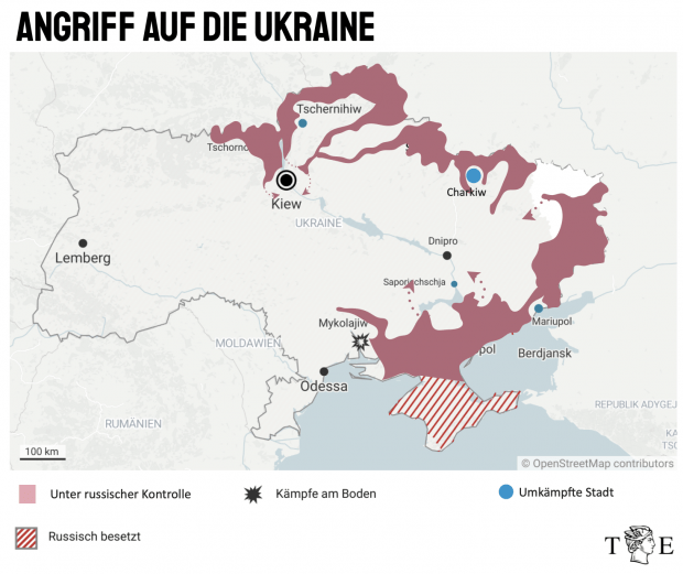 Nach ukrainischen Armeeangaben hat es zudem eine Landung russischer Luftlandeeinheiten in der Stadt gegeben. Es gibt heftige Kämpfe in und um die Stadt, ohne größere Rücksicht auf die Zivilbevölkerung. Ähnlich sieht es in Mariupol im Süden aus, die Stadt am Asowschen Meer ist vollständig von der restlichen Ukraine abgeschnitten. Mariupol ist ebenfalls mehrheitlich russischsprachig – dennoch leistet die Stadt seit Tagen Widerstand.