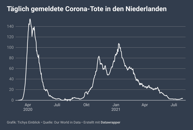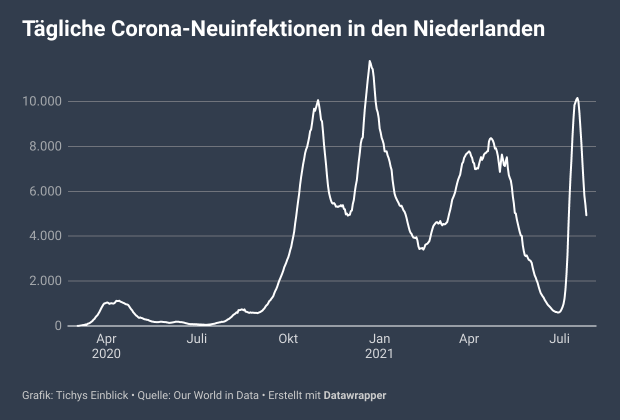 Die Delta-Welle in den Niederlanden führte zu vielen gemessenen Infektionen – deren Zahl aber jetzt rapide sinkt. Währenddessen gab es im ganzen Zeitraum der Welle auf die Bevölkerung bezogen weniger Coronatote als in Deutschland.