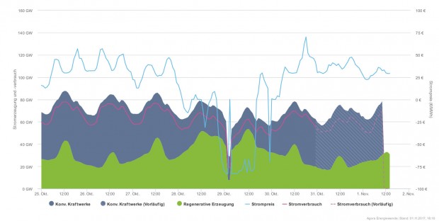 Mal einen Blick auf die anderen Reiter der Grafik geworfen. Speziell der Reiter „Import/Export“ lässt mich grausen. Gerade in der schönsten Zeit zwischen April und August gab es massive Fluktuationen im Netz (zeitweise negativer Saldo), ohne Kohle und Gas wäre das Stromnetz wohl kollabiert. Ich möchte nicht wissen was passiert wenn unsere Nachbarländer genau die gleiche absurde Strompolitik fahren wie wir. Wer hilft uns denn dann aus der Patsche?
